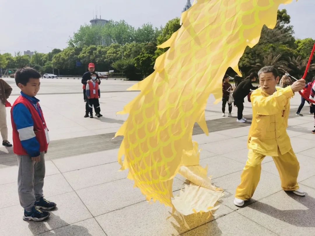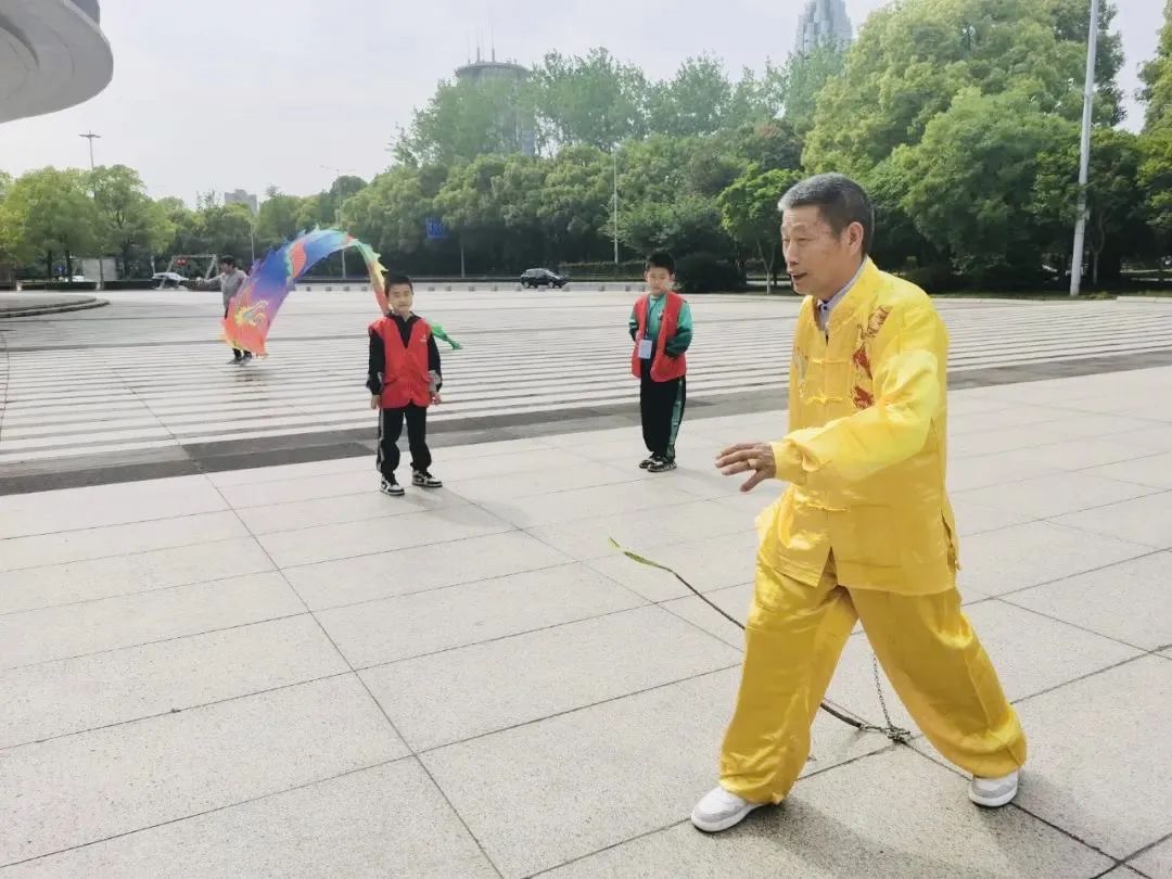 舞鞭龙是一种由鞭艺衍生出来的介于艺术体操和传统舞龙之间的龙舞项目,由“抖、甩、翻、滚、牵、抛、盘、跳”等基本动作及部分技巧动作组成。健身鞭协会张会长为小记者们示范反绕“8”字舞鞭龙的技巧,热心的家长朋友也和孩子一起参与到了运动之中。