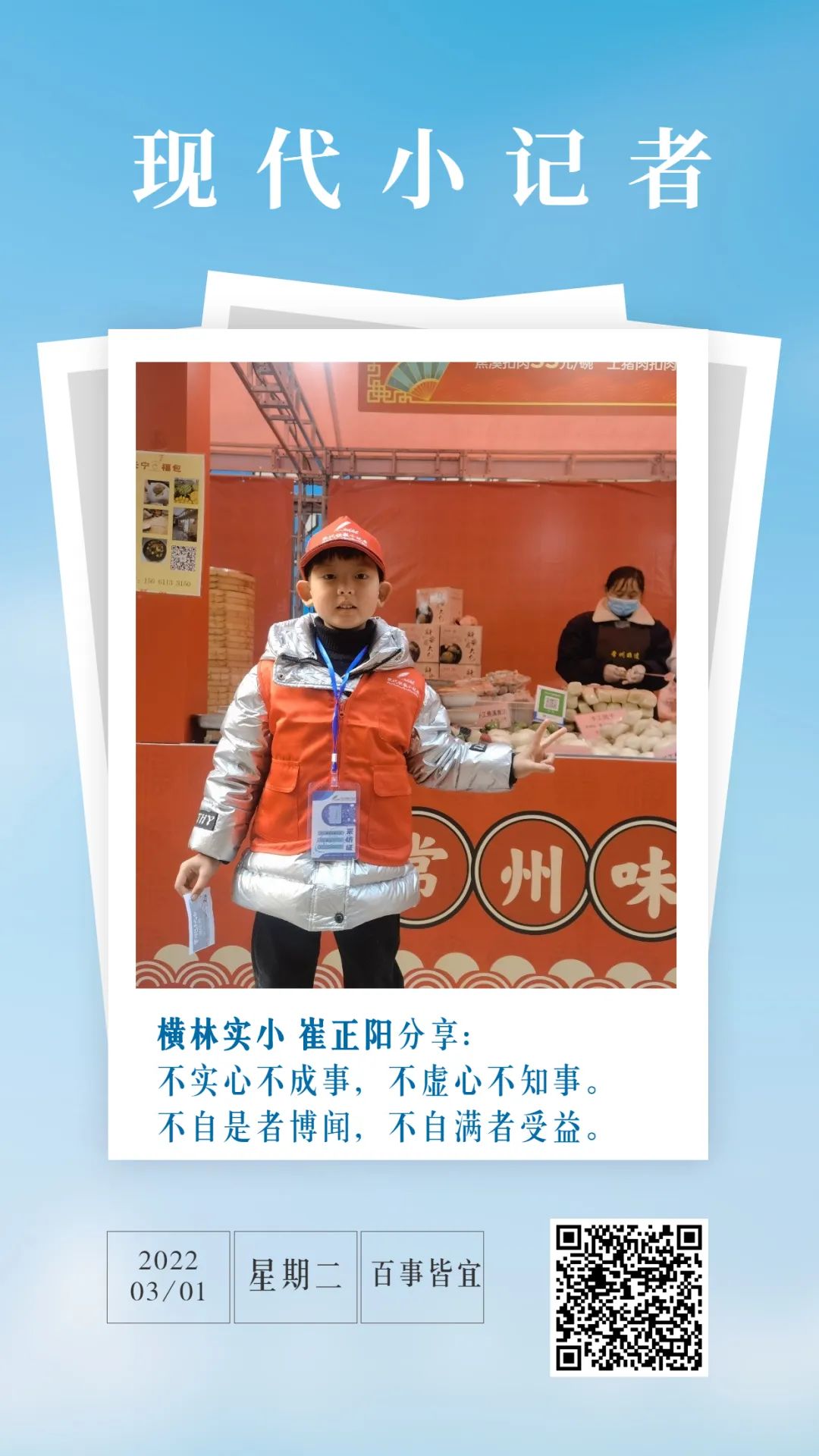 来自横林实验小学的崔正阳小记者,最喜爱的一句话是:不实心不成事,不虚心不知事。不自是者博闻,不自满者受益。