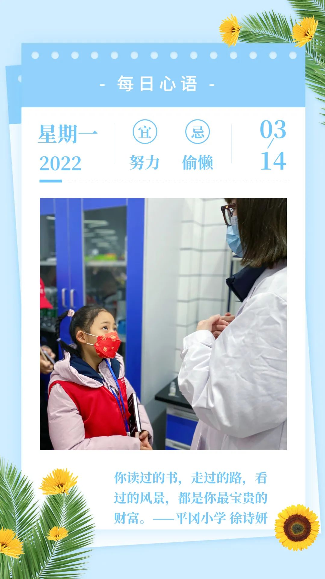 没有一个冬天不可逾越,没有一个春天不会来临。今天给大家带来祝福的是:实小教育集团平冈校区的徐诗妍小记者。