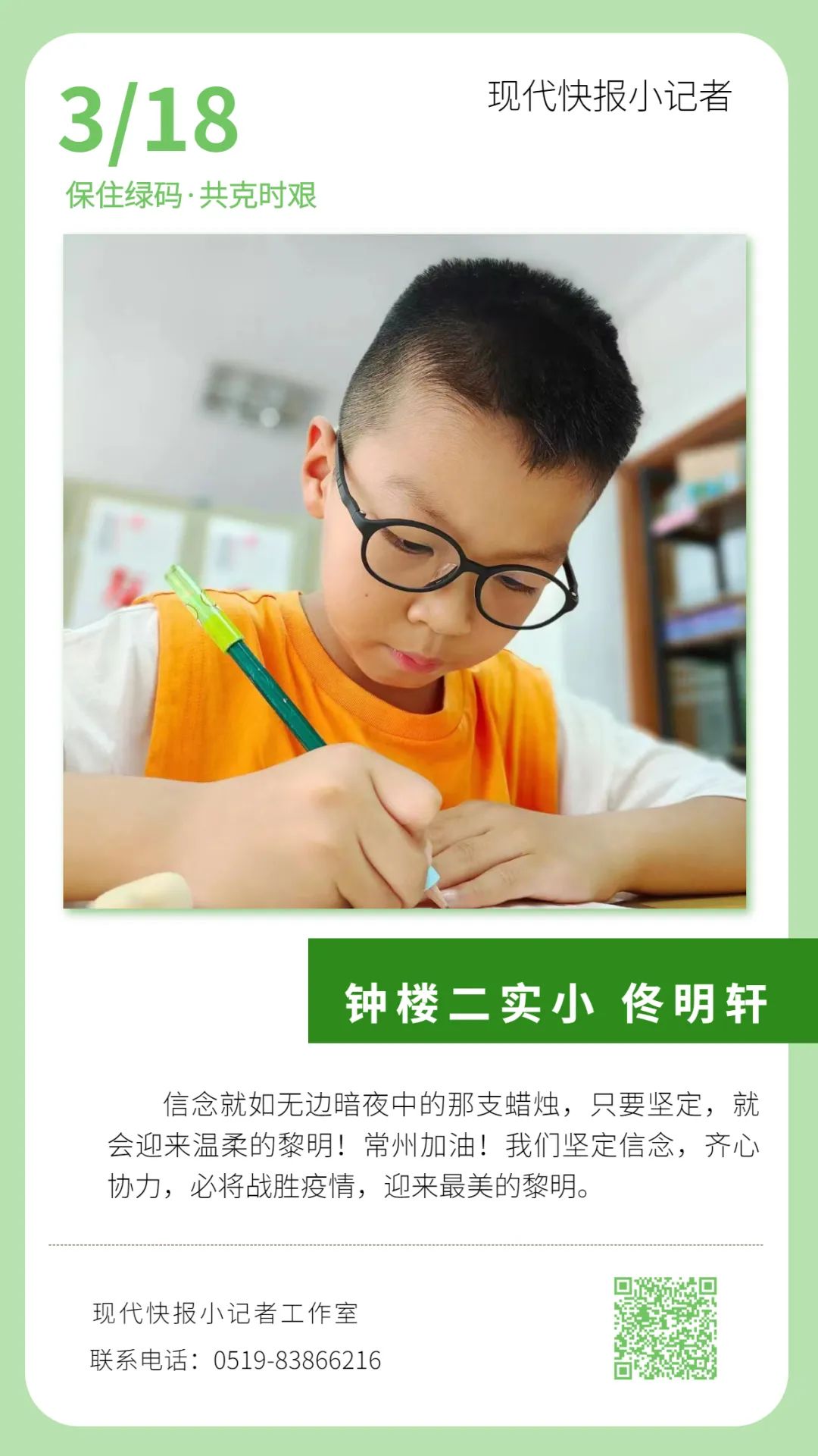 我们的城市生病了,需要大家一起关爱她,保护她。同时,疫情期间,小记者们也一定要正确戴口罩,勤洗手,做好防范。来自钟楼区第二实验小学的佟明轩小记者想对大家说:“信念就如无边暗夜中的那支蜡烛,只要坚定,就会迎来温柔的黎明!常州加油!我们坚定信念,齐心协力,必将战胜疫情,迎来最美的黎明。”