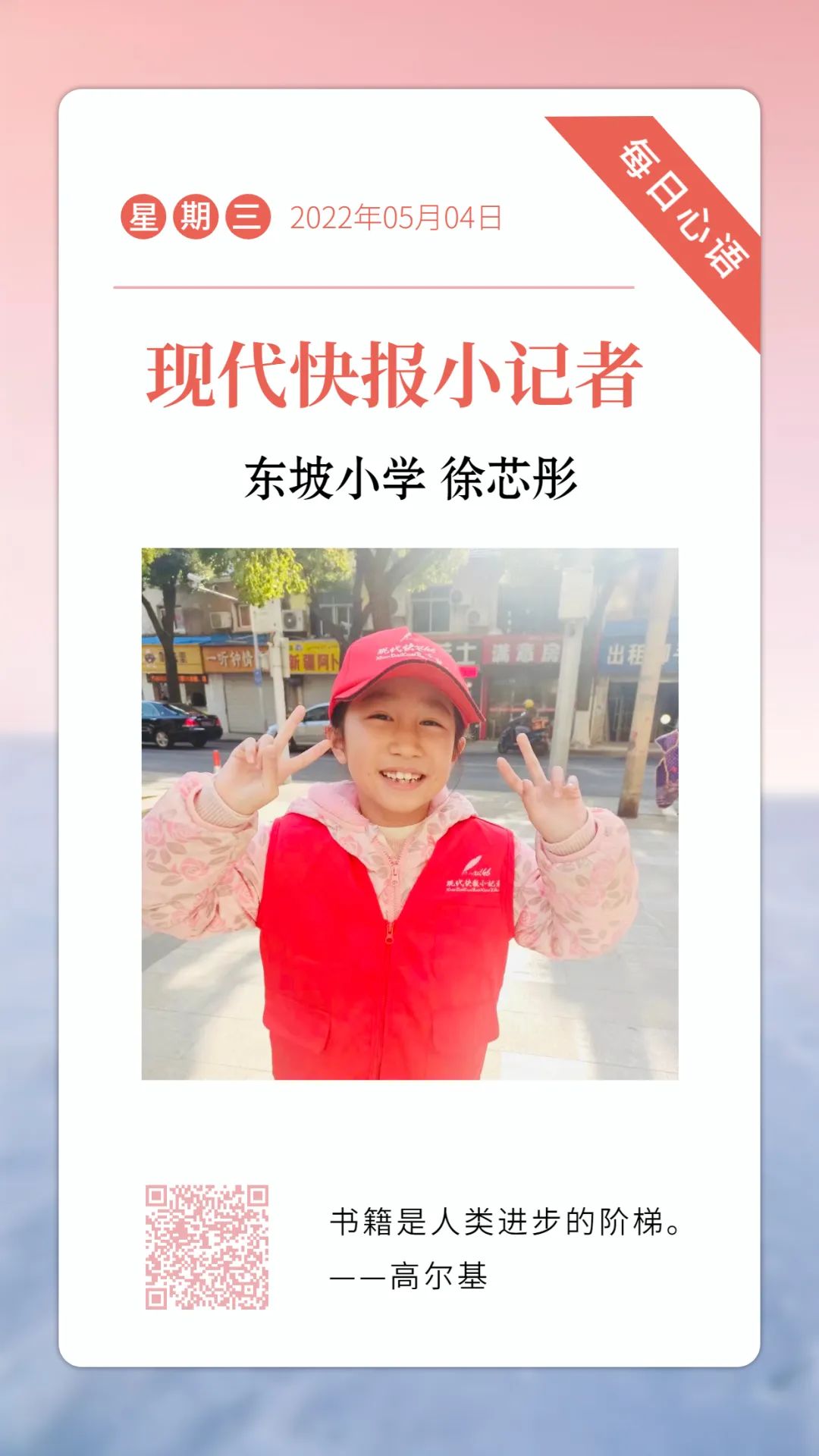 今天的小主人公是来自东坡小学的徐芯彤小记者。高尔基先生的名言——“书籍是人类进步的阶梯”,是她最喜爱的话语。