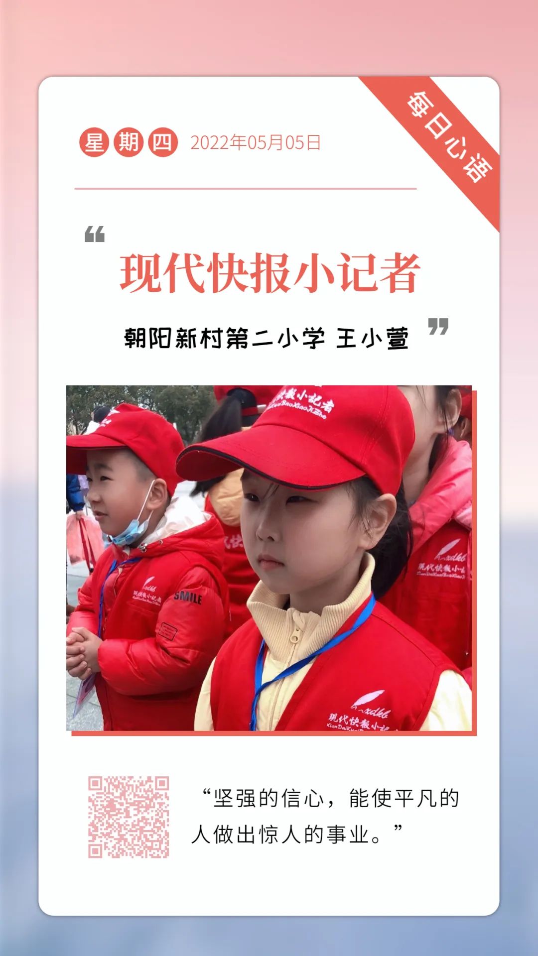 王小萱小记者,你活泼可爱,聪颖好学。你说“坚强的信心,能使平凡的人做出惊人的事业”,可见你是一位志向远大、坚强无畏的小记者,为你点赞。快报小记者工作室祝你“长风破浪会有时,直挂云帆济沧海”,愿你继续勤奋努力,才华横溢,未来可期。