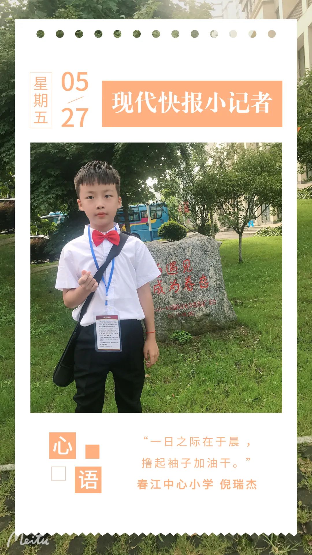 今天的小主人公是来自春江中心小学的倪瑞杰小记者。他最喜爱的一句话是:“一日之计在于晨,撸起袖子加油干。”