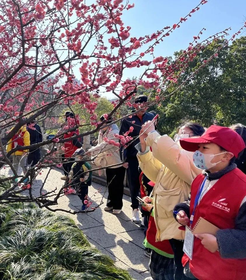 小记者们在老师的带领下,漫步在红梅公园,从文笔塔、红梅阁到古春轩、中央大草坪......无论走到哪,都能看见梅花的身影。宫粉、江梅、玉蝶、杏梅、绿萼、美人梅等近千棵梅花树争奇斗艳,入目皆花影,处处尽芳菲。其中要数赫赫有名的“红梅阁”,这里的梅花数量最多、品种最全。