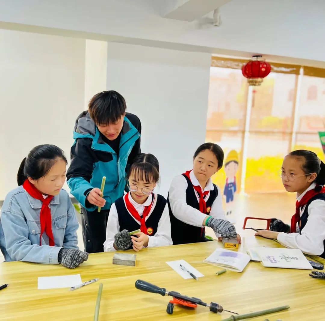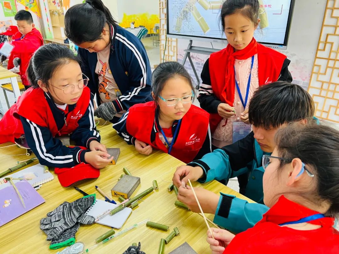 制作环节,小记者们摩拳擦掌,迫不及待地准备动手制作。大家分工明确,有的取一截竹子,按照比例聚精会神地锯着竹子,有的拿起锯好的小竹管仔仔细细地打磨,还有的在老师指导下学习如何将使用钻孔工具……