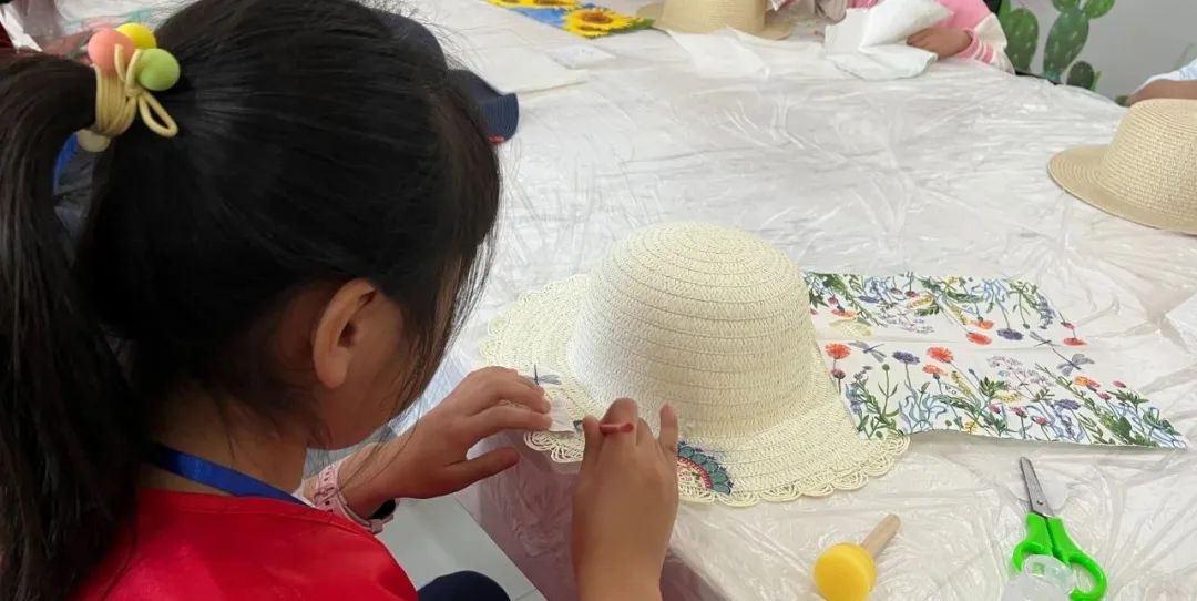 在老师的指导下小记者们按自己的喜好剪下所需要的图案,粘贴到草帽上,刷上了一层“蝶古巴特”专用胶水,并将事先剪好的图案贴在包上,一款款独一无二的艺术草帽便完成了。