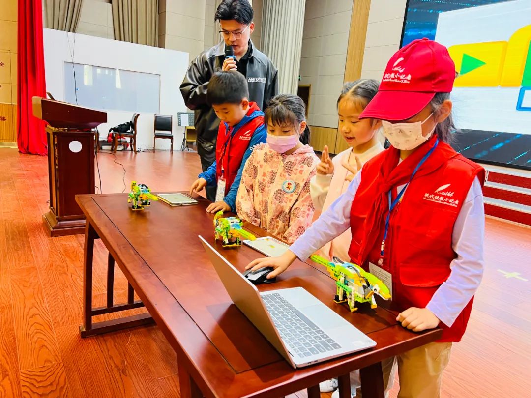 “小记者们,找一找我给你们准备的小恐龙在哪?”“在那,在那!”小记者们激动地呐喊。在大家的欢呼雀跃中,迎来了期待已久的体验游戏。在马老师地耐心指导下,小记者代表亲身感受了图形编程的乐趣。只见可爱的“小恐龙”,在小记者的操控下,缓缓向前爬行。“哇,大家快看,我的恐龙会动呢,真是太有趣啦!”小记者情不自禁地说。