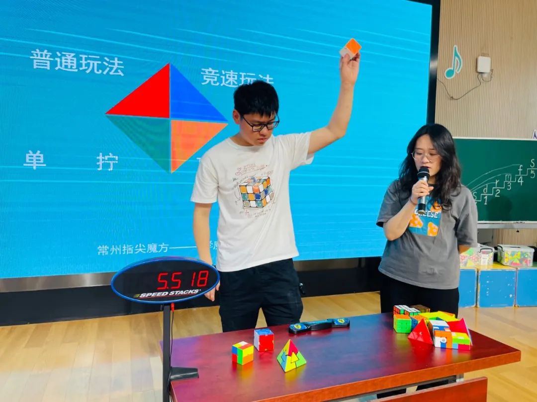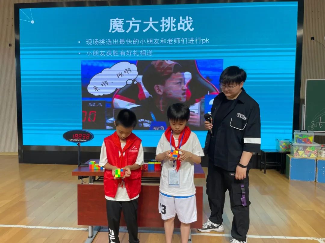 活动伊始,指尖魔方的枪老师邀请小记者上台挑战魔方还原。两分钟时间为限,小记者争分夺秒,全场的焦点都在这些小记者手中的魔方上。“加油!加油……”台下的小记者们为小伙伴呐喊鼓劲。最终,小记者挑战成功,赢得了全场的热烈掌声。