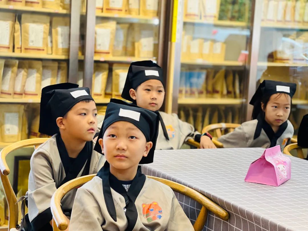 小记者们换上汉服,仿佛穿越了时光,化身为一名名小药师,开始今天的医药知识学习之旅。