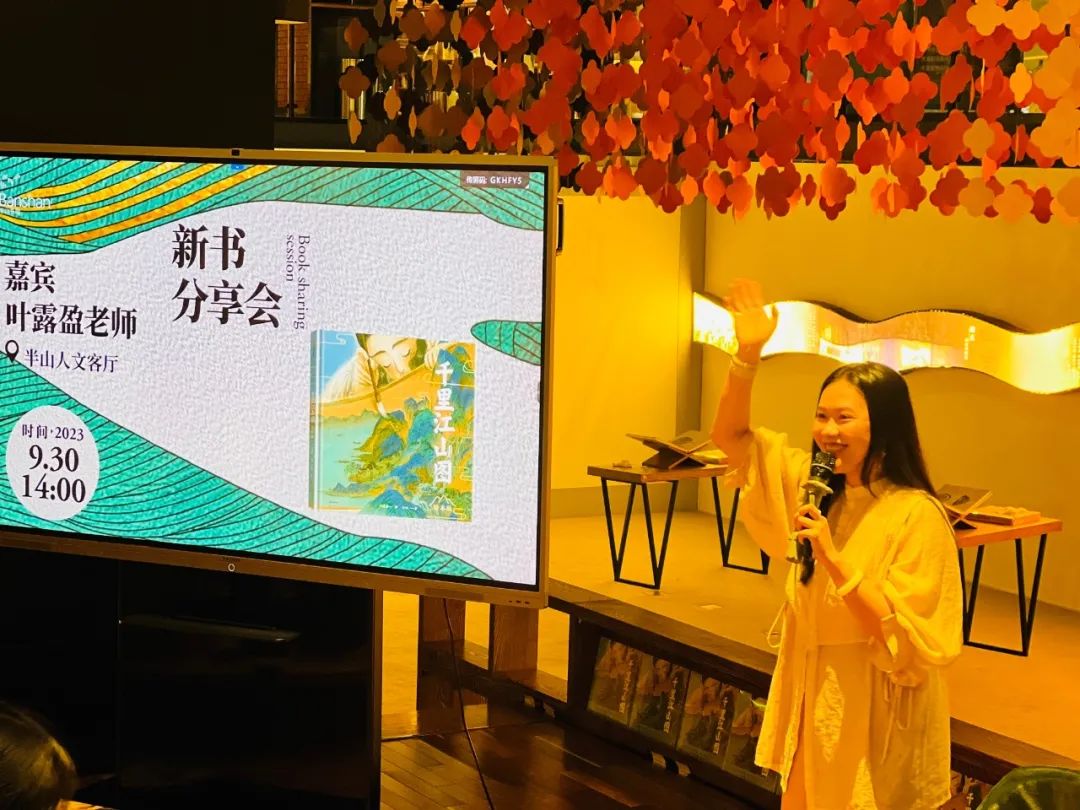 在新书分享会上,叶老师分享创作《千里江山图》的心路历程。她以名画《千里江山图》背后传奇故事为核心,带领小读者们一起了解少年王希孟的成长之路。