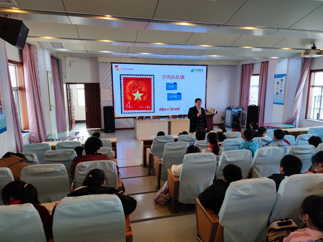 成老师用生动的语言和丰富的邮票资料,全面回顾了少先队的光辉历程,以及新中国从站起来、富起来到强起来的伟大飞跃。在讲解过程中,成老师不时与同学们互动,引导他们思考历史与现实的联系,激发了孩子们对少先队历史的浓厚兴趣和对祖国发展的自豪感。