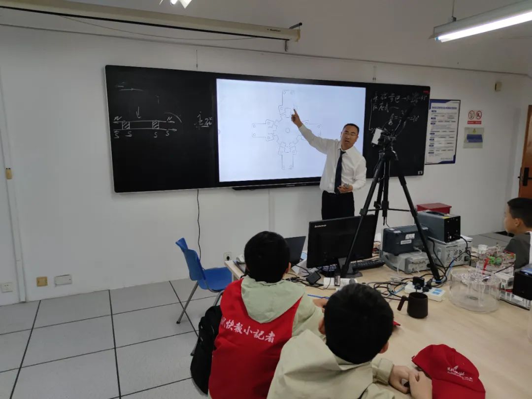 在此次研学活动中,嵇明军教授首先为同学们带来了一堂别开生面的机电入门课。考虑到现场许多初一学生尚未系统学习物理知识,嵇教授精心设计了一套直观易懂的教学方案。他通过实时投屏系统,将实验操作细节清晰地展现在大屏幕上,让每位同学都能近距离观察到最直观的电磁控制原理。"虽然你们还没学物理,但通过今天的观察,相信大家已经掌握了电磁控制的基本概念。"嵇教授总结道,"这就是机电一体化的魅力——用电来控制机械,让机器按照我们的想法来工作。"课后,不少同学表示,这个演示让他们对即将学习的物理课程充满了期待。