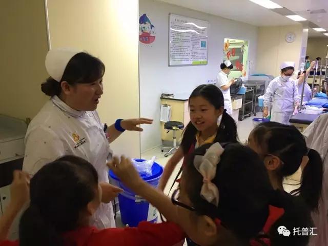 另一组小记者来到输液室,观察医护人员的相关工作并手舞足蹈地提出自己的问题